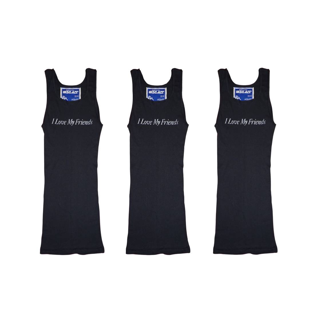Introducing the Friendship 3-Pack Tank Tops, a timeless wardrobe staple. These genderless, soft ribbed tank tops are made to order and feature the signature "I Love My Friends" message screen printed in white. Made of 100% ribbed cotton, they offer a comfortable and breathable fit that’s perfect for any season. Share them with your closest friends or keep all three for yourself—these tanks are designed to celebrate community and connection. Each tank is hand-printed, making every piece uniquely yours.